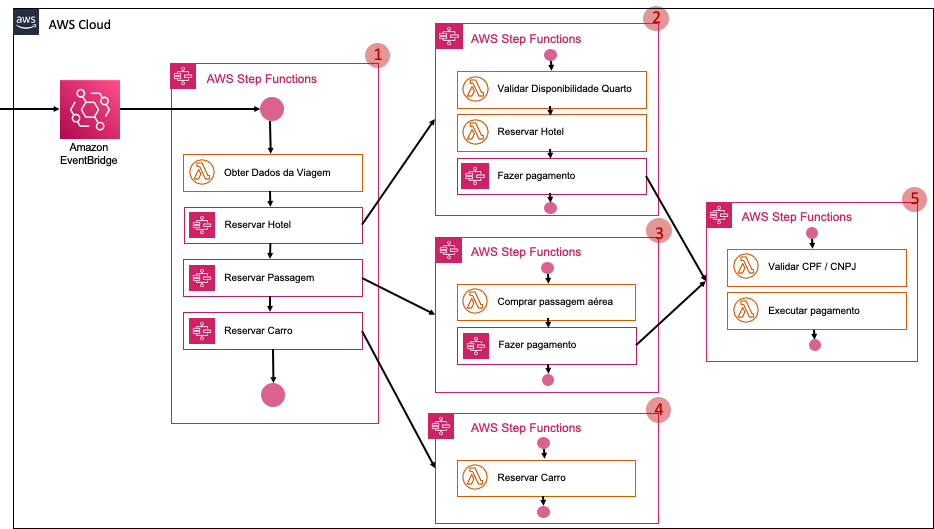 O exemplo a seguir mostra uma solicitação de uma compra de um pacote de viagem que contempla a validação dos dados do solicitante (através de um micro serviço em AWS Lambda), realiza execução de um fluxo de trabalho para reservar e efetivar o pagamento do hotel, um segundo fluxo de trabalho para emissão e pagamento de passagem aérea e um último fluxo de trabalho criado para gerenciar a reserva de carro.