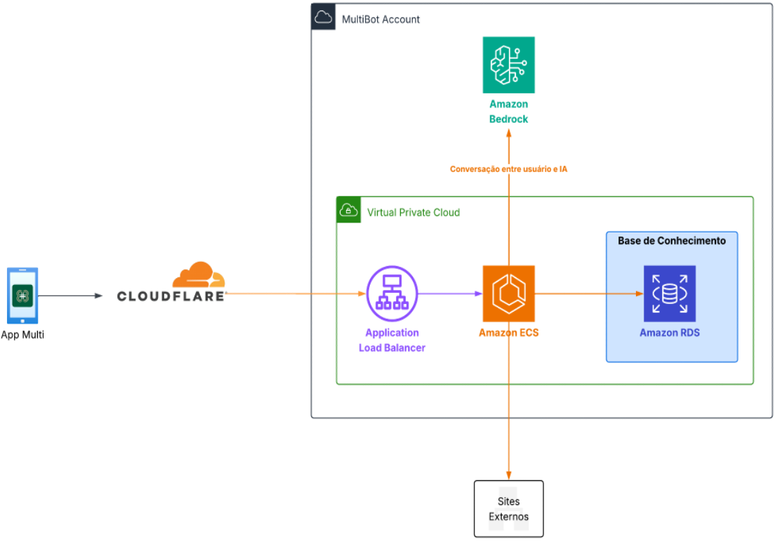 O Amazon ECS fornece a flexibilidade de containerização necessária para escalabilidade automática durante eventos de alto volume de acesso, como feriados, datas comemorativas e períodos de maior movimento, além de hospedar o processo de varredura automática que mantém a base de conhecimento sempre sincronizada com as informações mais recentes. O Amazon RDS foi implementado para realizar buscas semânticas de forma ágil, encontrando informações contextualmente relevantes em milissegundos. O Application Load Balancer completa a arquitetura distribuindo o tráfego de forma inteligente, garantindo alta disponibilidade independentemente de onde o chatbot seja acessado – seja através do navegador web ou integrado nativamente ao aplicativo MULTI.