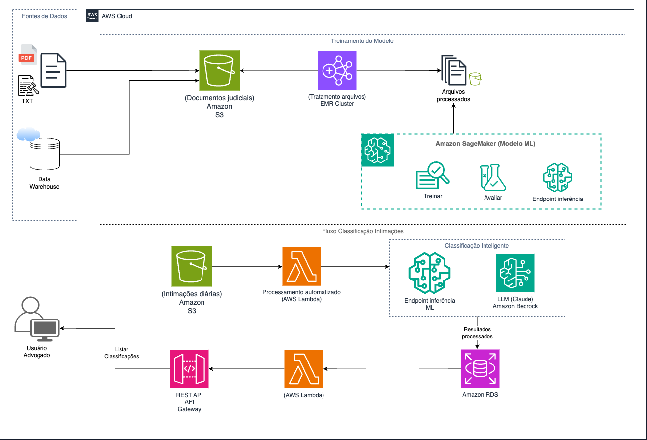 - Amazon S3: armazenamento seguro dos documentos judiciais, modelos treinados e dados históricos