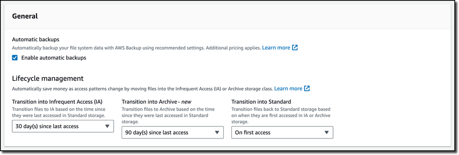 Você pode usar o EFS Archive com sistemas de arquivos existentes configurando as políticas de ciclo de vida do sistema de arquivos. Novos sistemas de arquivos são criados por padrão com uma política de ciclo de vida que faz a transição automática dos arquivos para o EFS IA após 30 dias e para o EFS Archive após 90 dias desde o último acesso.