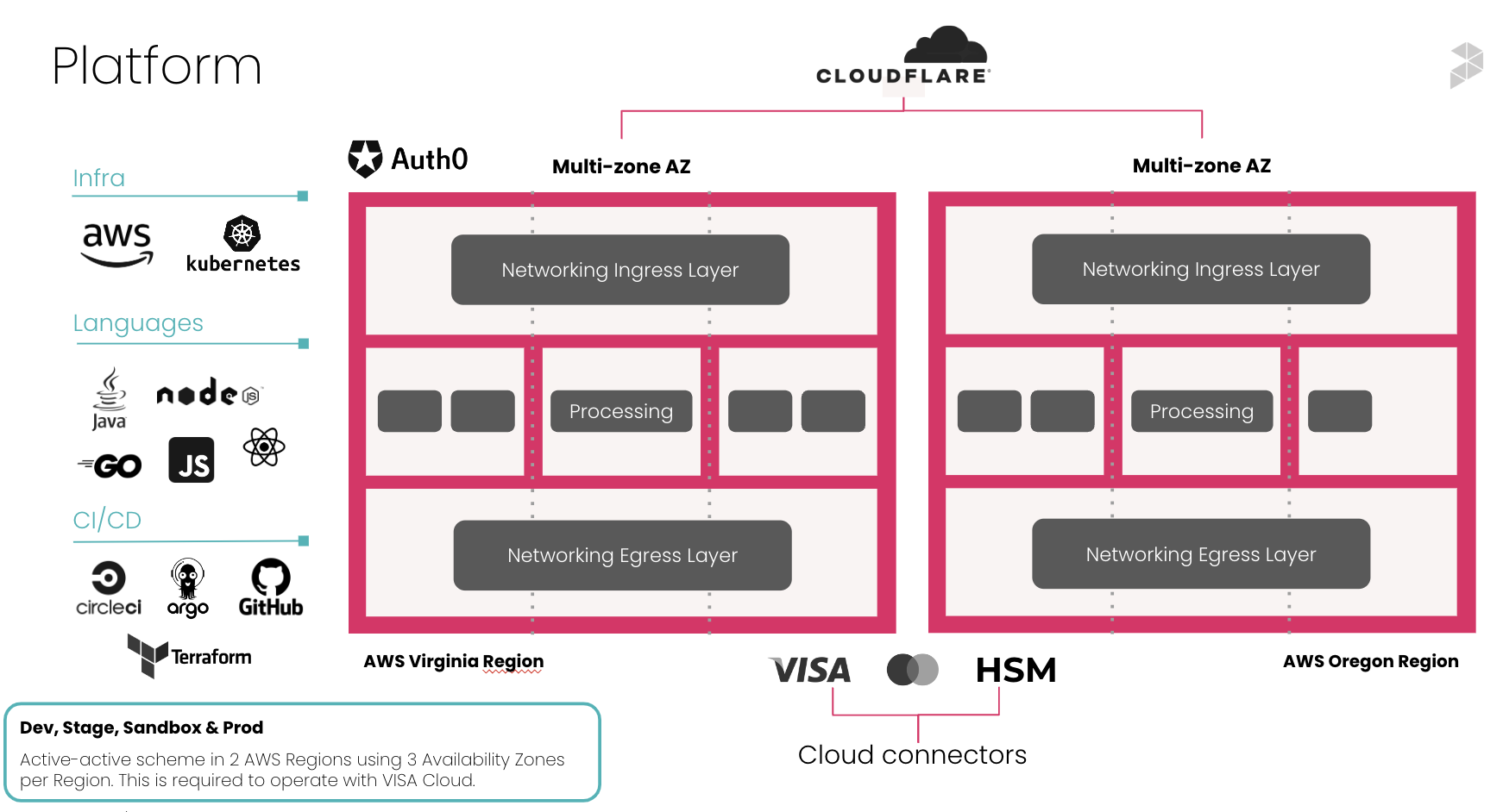 Seus principais fluxos são montados em uma arquitetura ativo-ativo em duas regiões da AWS (Virgínia e Oregon), em um esquema multicontas, com um mínimo de três zonas de disponibilidade em cada uma delas, e vários ambientes – sendo estes os ambientes de desenvolvimento, staging, produção e Sandbox.
