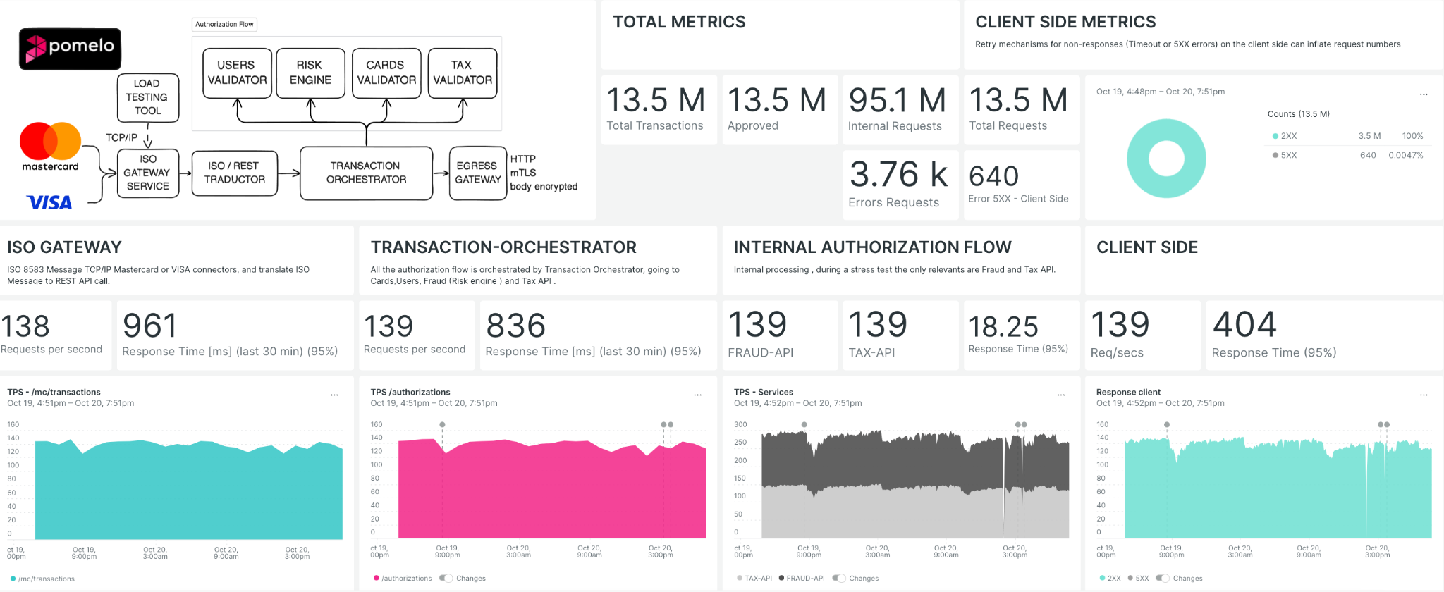 Para testar essa disponibilidade internamente, a Pomelo está atualmente executando testes de estresse e de caos em seus clusters Kubernetes multirregionais baseados no EKS, onde toda essa infraestrutura está com observabilidade de pilha completa (full-stack). Com isso, é possível comprovar uma capacidade de processamento de mais de 600 tps (transações por segundo) – ou seja, mais de 50 milhões de transações por dia! Cada transação internamente equivale a 6 a 15 solicitações de microsserviços, dependendo dos fluxos.