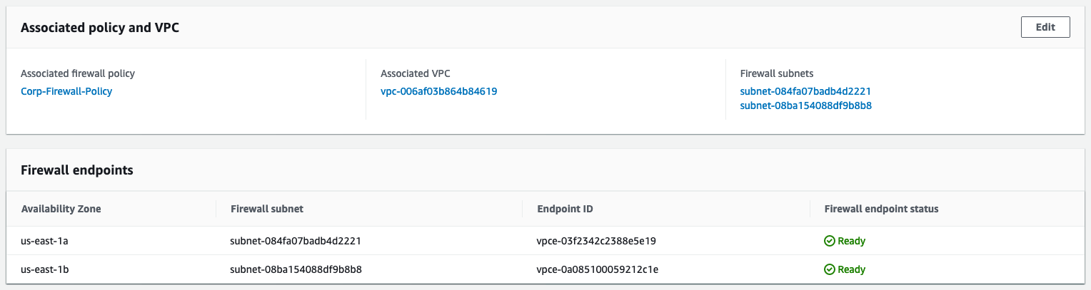 Depois que o firewall estiver no estado pronto (Ready), você poderá ver os IDs de endpoint dos endpoints do firewall, conforme mostrado na Figura 8. Os IDs de endpoint são necessários ao atualizar as tabelas de rotas da VPC.