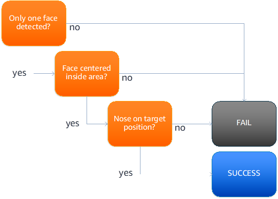 A abordagem central da arquitetura solicita que os usuários realizem um desafio. Por exemplo, os usuários devem mover o nariz para uma posição de destino, definida aleatoriamente, exibida na tela. Isso aciona uma série de processos de verificação que validam se: