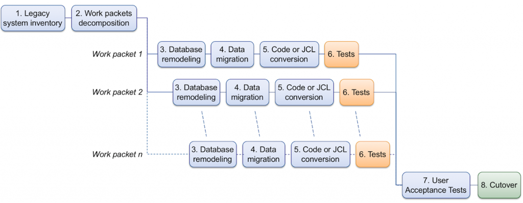 - Etapa 6: executa testes de regressão para cada pacote de trabalho, garantindo que haja uma equivalência funcional entre os programas de mainframe de origem e o novo código Java.