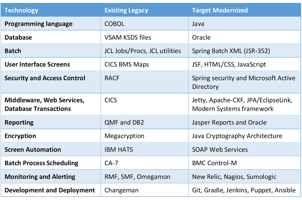 Para manter a mesma experiência do usuário, os mapas CICS BMS foram migrados para páginas web equivalentes que mimetizam às telas 3270 originais. Cada programa COBOL tornou-se uma classe Java, e JCL tornou-se JSR-352 XML usando o runtime Spring Batch para Java. Os arquivos VSAM KSDS foram migrados para um banco de dados relacional Oracle. Durante o processo de refatoração, todos os registros VSAM foram analisados e um DDL foi gerado para cada um dos layouts escolhidos.