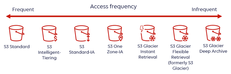 Por exemplo, é possível utilizar o Amazon S3 Glacier para armazenar dados históricos com acessos esporádicos, garantindo a retenção de longo prazo com um custo reduzido. Uma das características do S3 é que ele foi projetado para fornecer 99,999999999% de durabilidade, isto significa na pratica que se você armazenar 10.000 objetos no Amazon S3, poderá esperar, em média, a perda de um único objeto a cada 10.000.000 de anos. Outra característica importante deste serviço é o WORM (Write Once Read Many) do Object Lock do Amazon S3, que garante a segurança e imutabilidade do dado, por fim as classe de armazenamento que são importantes sob uma perspectiva de custo dependendo da frequência de acesso conforme ilustrado abaixo: