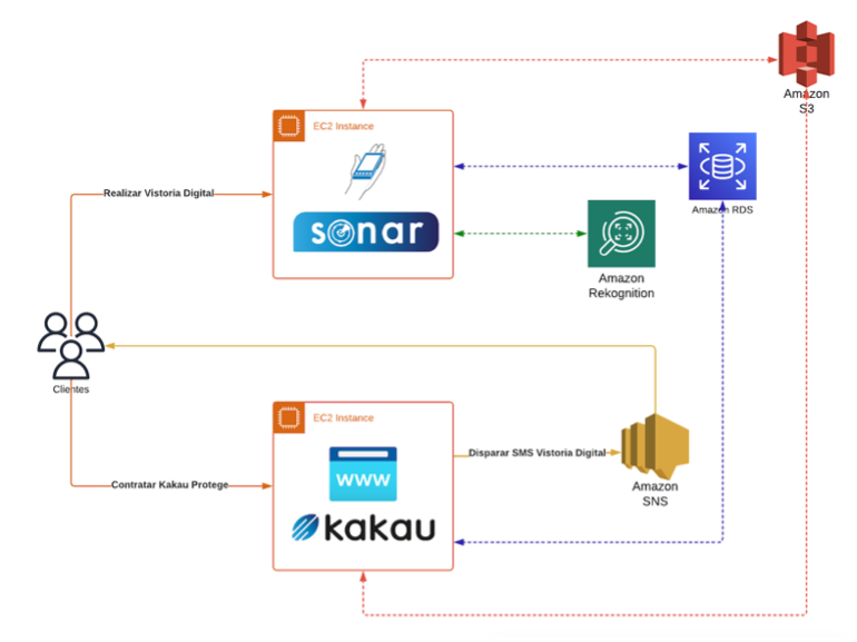A Kakau, com apoio da AWS, desenvolveu o Sonar, uma solução que conta com serviços: Amazon EC2 para hospedagem de servidores de aplicação, O Amazon Rekognition para análise das fraudes e prova de vida, Amazon S3 como armazenamento de objetos, Amazon RDS para hospedagem de Banco de Dados e o Amazon SNS para envio de notificações.