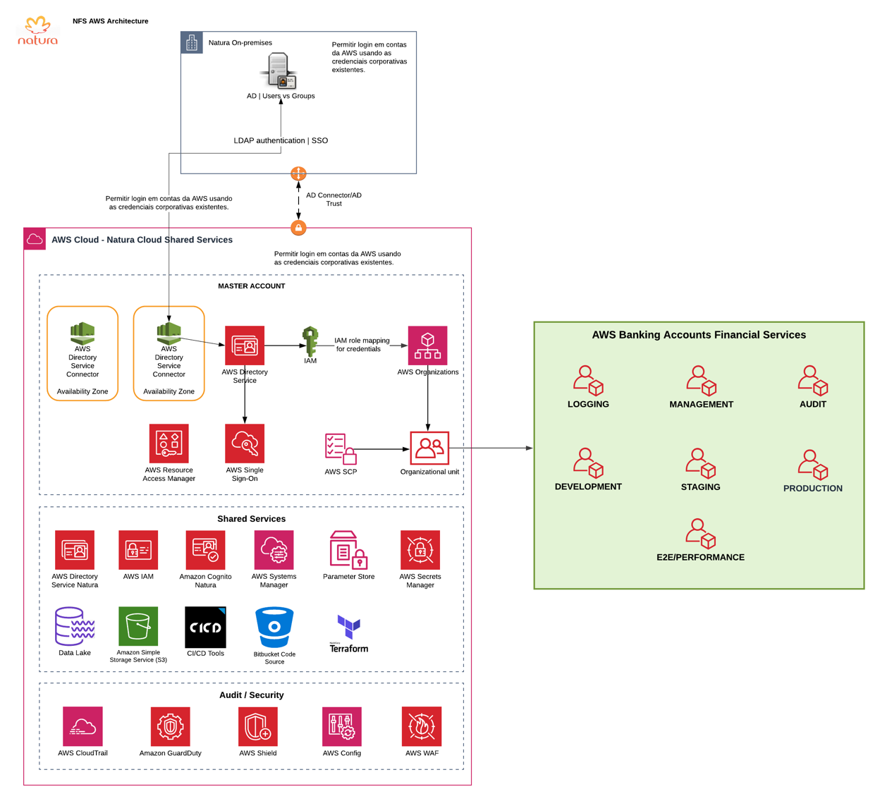 Entendendo os diferentes requisitos e estratégia do novo negócio, foi implementada uma nova infraestrutura utilizando organization units. Essa arquitetura foi baseada em uma estratégia baseada em múltiplas contas, provendo o desacoplamento dos ambientes de desenvolvimento, homologação, E2E, performance e produção além do isolamento das contas de log e segurança. Todas as políticas relacionadas as contas estão concentradas em Service Control Polices (SCP) das Organization Units (OU).