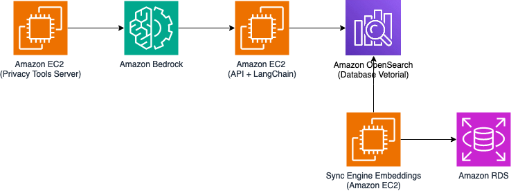 A Privacy Tools, com apoio da AWS, optou por desenvolver uma solução personalizada para IA generativa para privacidade com o uso de Amazon Bedrock, Amazon SQS, Amazon S3, Amazon RDS, Amazon OpenSearch e utilização do framework LangChain instalado em Amazon EC2.