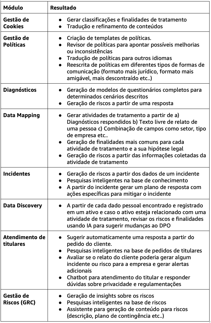 A plataforma é modular e para cada módulo a Privacy Tools os principais resultados da implementação de uma IA Generativa: