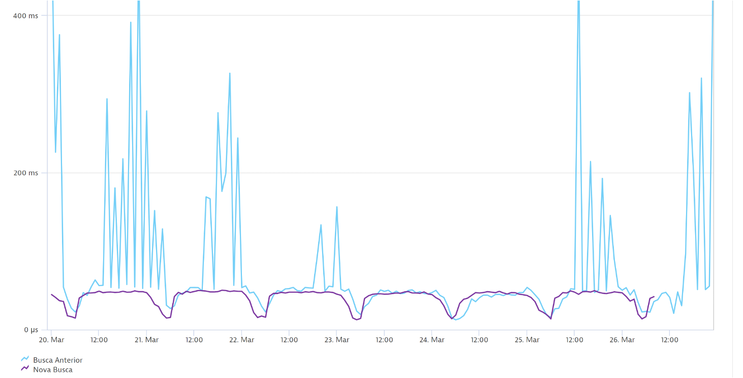 Além disso, ao analisarmos o desempenho do mecanismo de busca, notamos que, em média, as consultas feitas com o novo mecanismo são concluídas em menos de 50 milissegundos. Isso indica não apenas melhorias funcionais, mas também um ganho considerável de performance em comparação com o sistema de busca anterior. O gráfico a seguir ilustra a comparação de desempenho (tempo de resposta) entre o sistema de busca anterior e o atual.