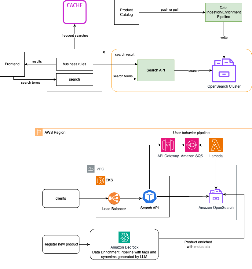 Com a análise de várias opções disponíveis, concluímos que o Amazon OpenSearch apresentava as características ideais para atender a esses requisitos. Ele não apenas oferece flexibilidade no armazenamento dos dados cadastrais dos produtos, mas também possibilita a aplicação de uma variedade de algoritmos de Machine Learning (ML), permitindo assim a obtenção de buscas fonéticas, vetoriais e outras.