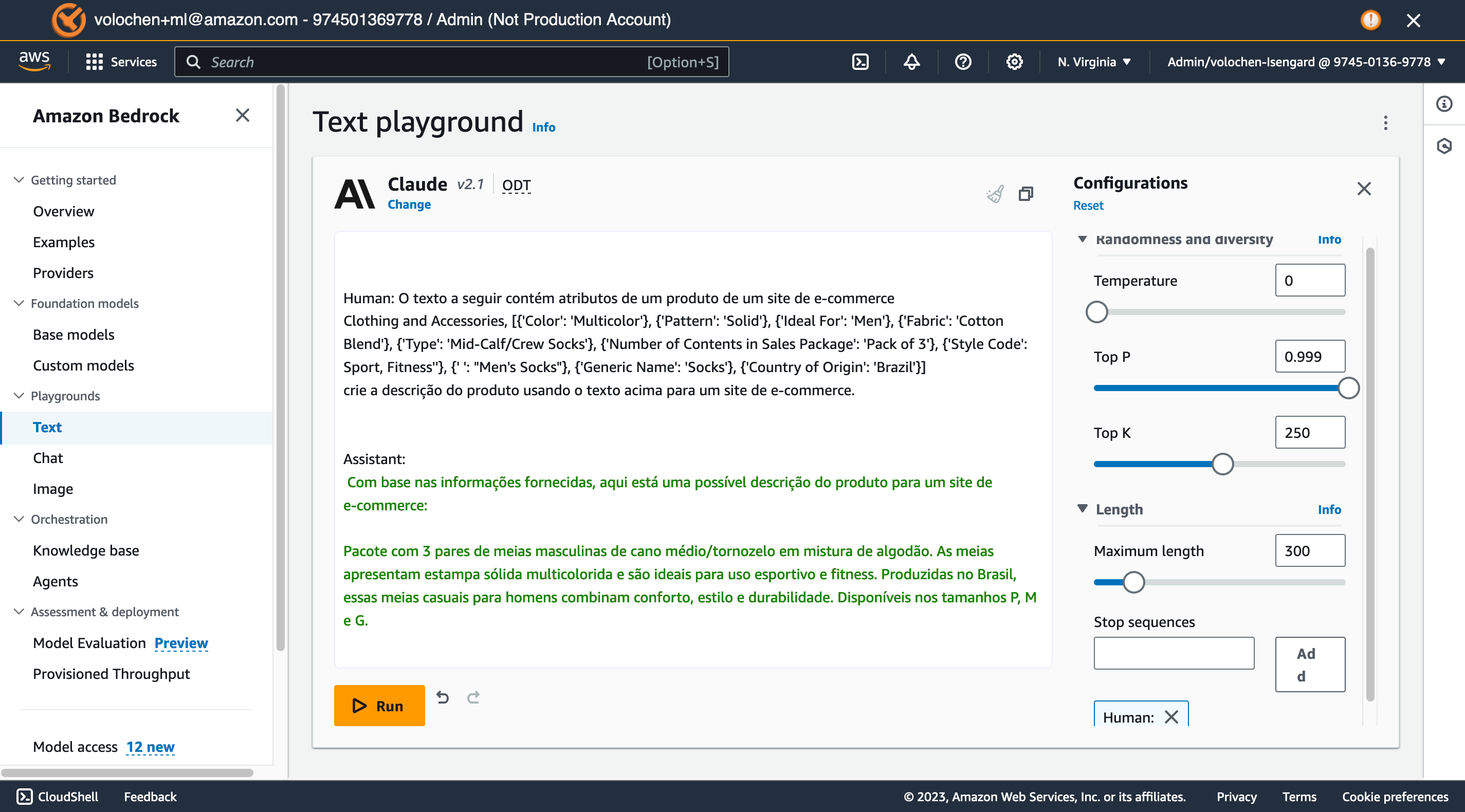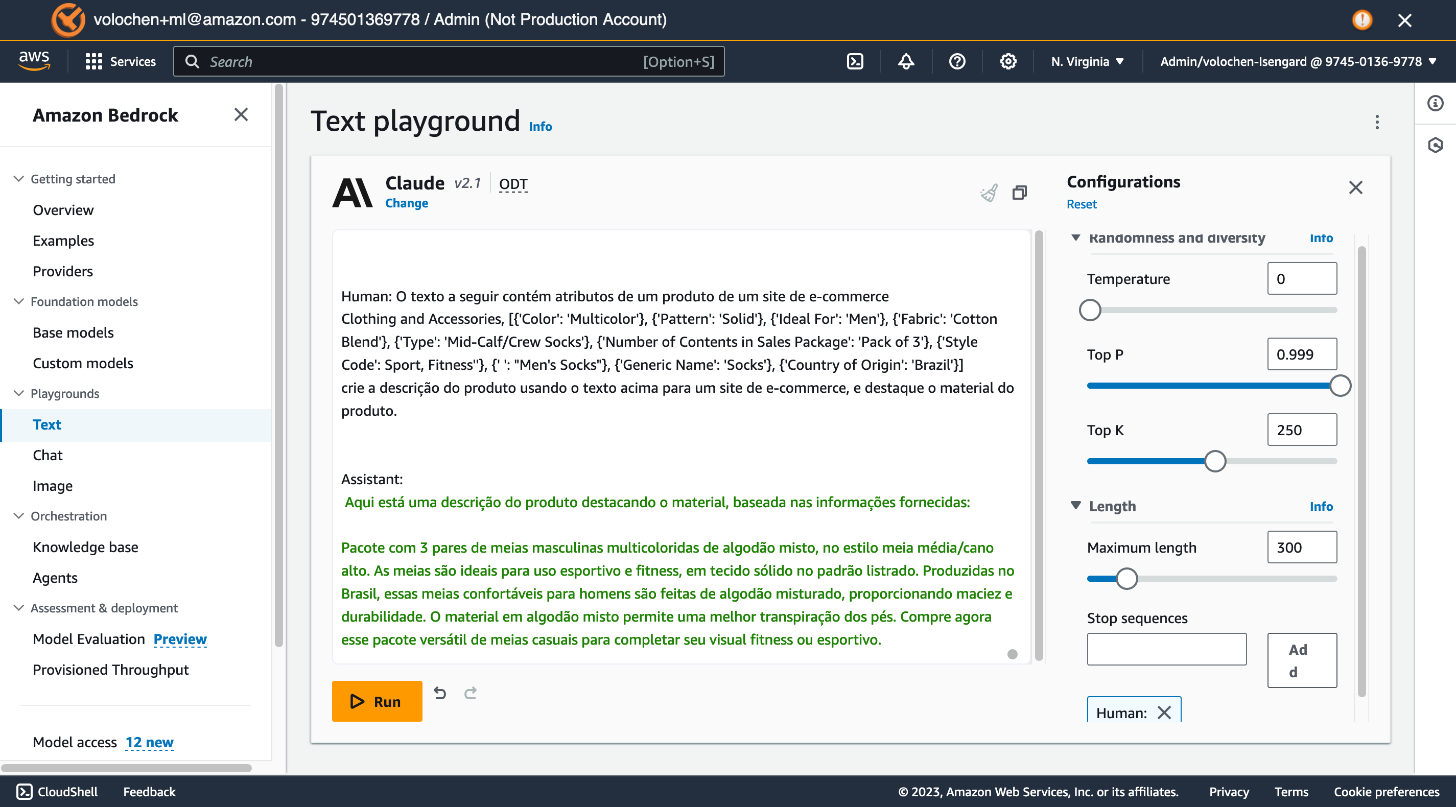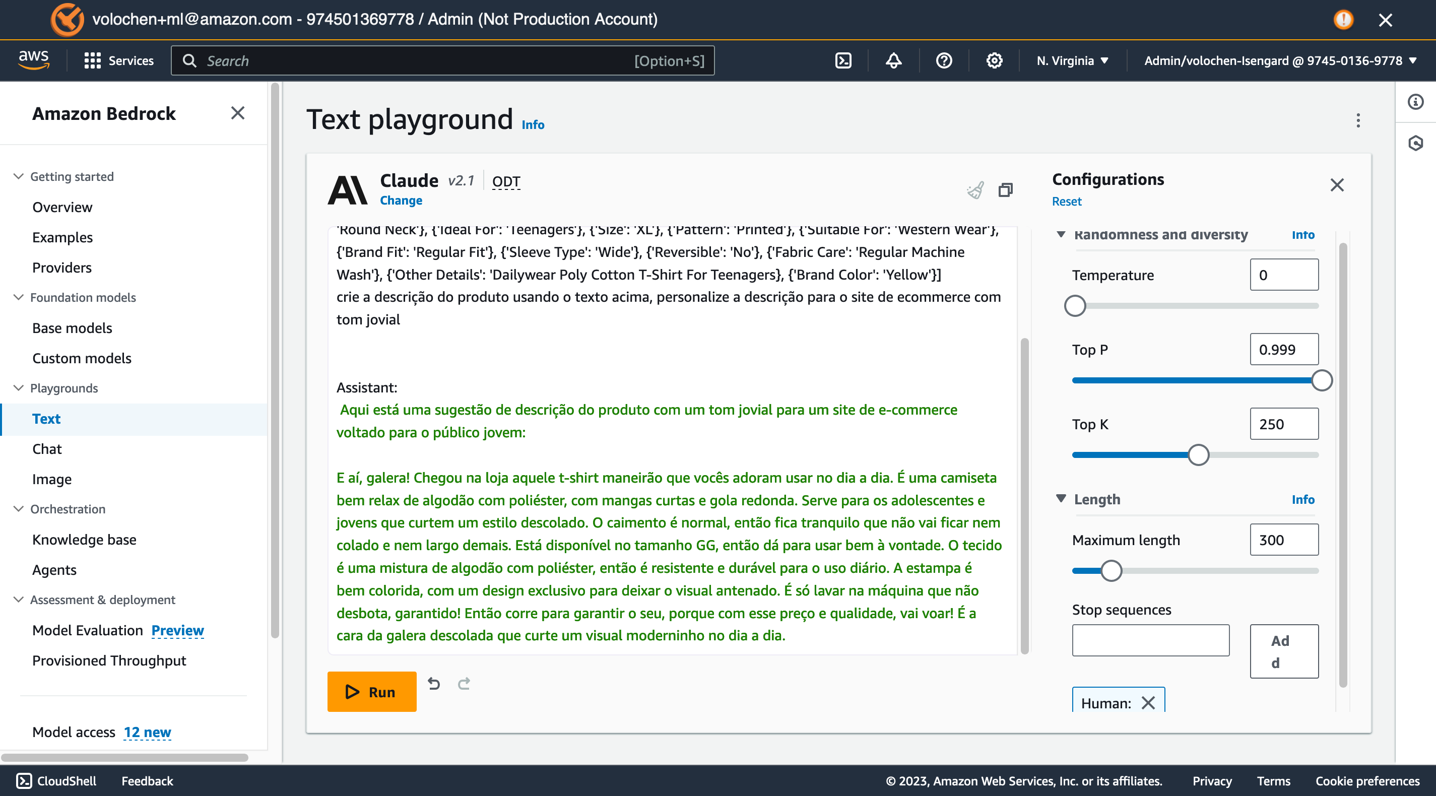 Clique no botão “Run” para submeter o seu prompt. Perceba que a resposta é enviada no formato de streaming, ou seja, conforme o FM vai gerando a resposta, ela é retornada através de tokens para a tela. Note que a função de streaming funciona somente para os FMs que tem o suporte a esta funcionalidade, consulte através da chamada da API “GetFoundationModel”.