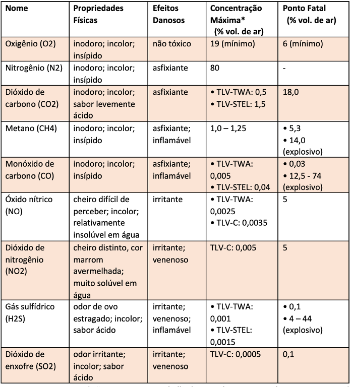A tabela abaixo apresenta alguns destes gases e a concentração a partir da qual eles podem trazer perigo aos trabalhadores.