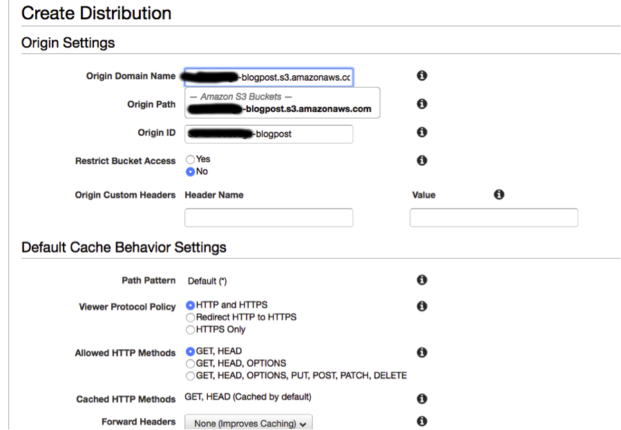 Crie uma distribuição Web, defina o bucket S3 como origem e deixe os outros campos como padrão.