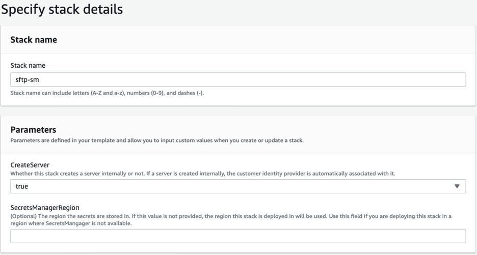 Faça download e implemente o modelo do AWS CloudFormation. Permita a criação do servidor SFTP nas opções de configuração.