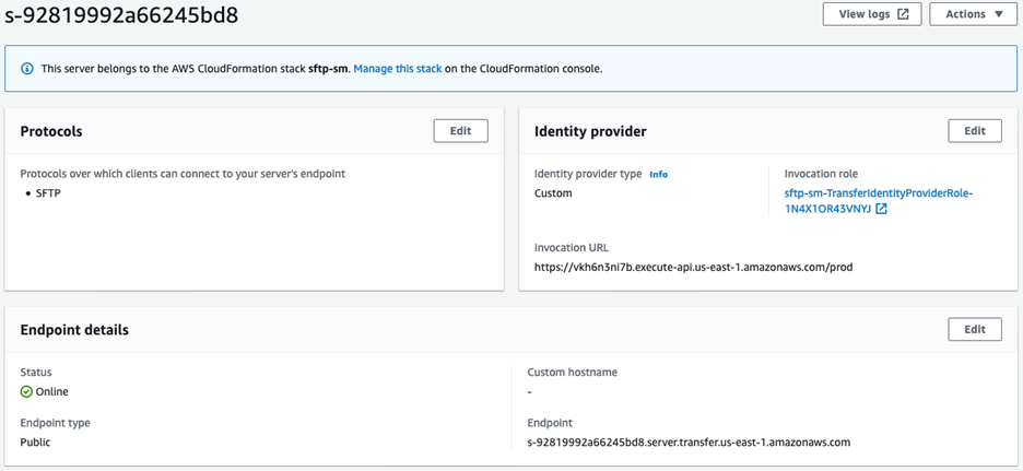 Após alguns minutos, você deve ter um servidor SFTP com o ponto de acesso do Amazon API Gateway como seu provedor de identidade.