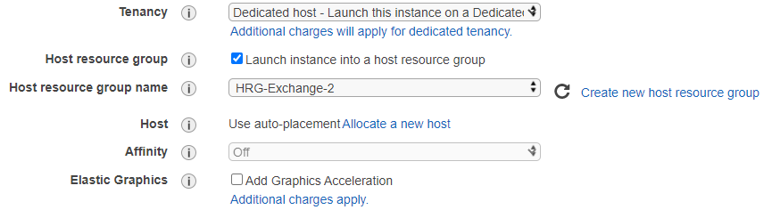 4. Em “Tenancy”, escolha “Dedicated Host”, marque “Launch instance into a host resource group” e, em seguida, escolha o primeiro grupo de recursos do host “HRG-Exchange-1″
