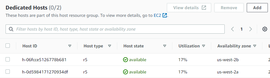 Figura 14: Lista de hosts dedicados alocados no console do EC2 que estão sendo gerenciados pelos grupos de recursos do host que você criou anteriormente.