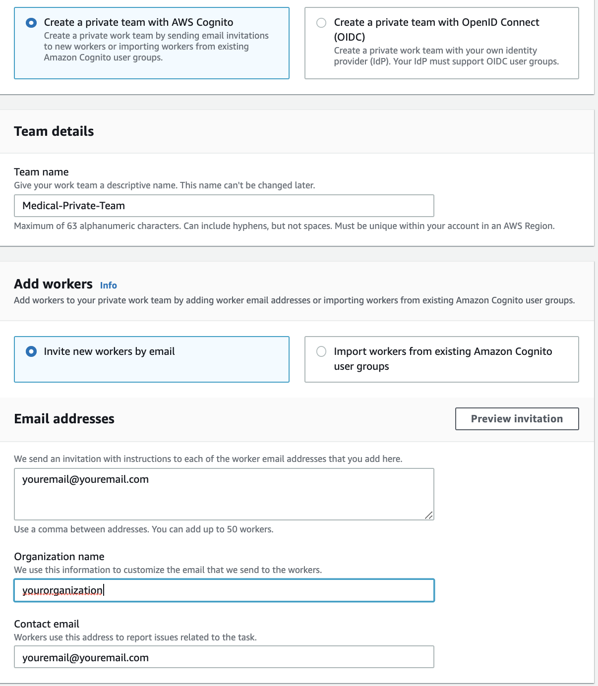 - Private team creation: Selecione “Create a private team with AWS Cognito”