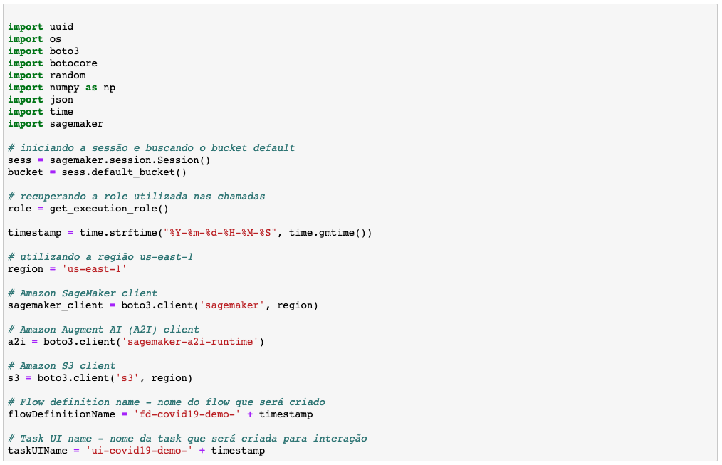 Abaixo vamos fazer inicializar nossas bibliotecas e configurar variáveis para posterior utilização. Para esse blogpost estamos utilizando a região us-east-1.