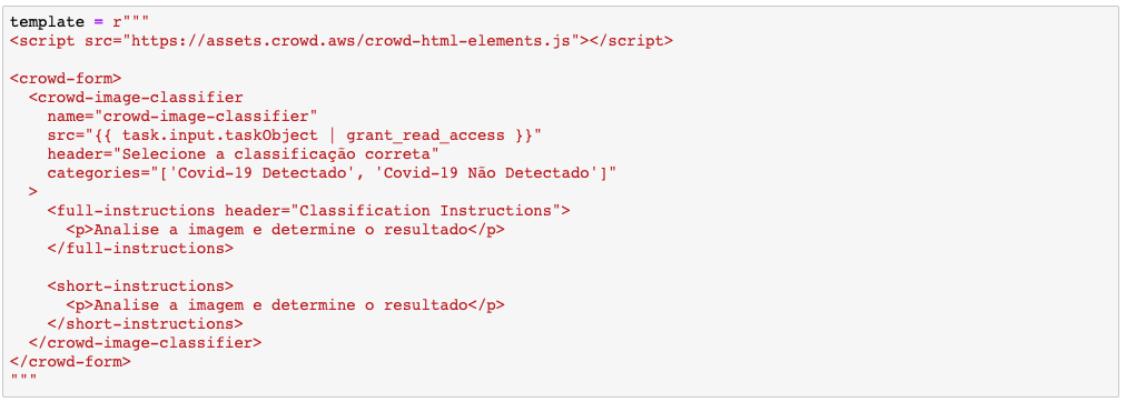 Com as variáveis e libs inicializadas, vamos criar o template, esse template será a base da nossa interface gráfica para validação. uma lista de templates de exemplo pode ser encontrada aqui: https://github.com/aws-samples/amazon-a2i-sample-task-uis