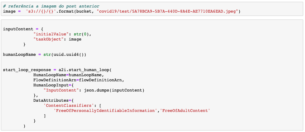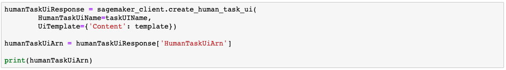 Na célula abaixo, vamos criar definir um workflow. Basicamente nosso workflow relaciona uma interface para uma tarefa humana, uma equipe (no nosso caso privada) criada anteriormente e um bucket onde vamos armazenar a resposta do nosso usuário que fará a interação com a tarefa. Mais detalhes sobre workflow aqui: https://docs.aws.amazon.com/sagemaker/latest/dg/a2i-create-flow-definition.html