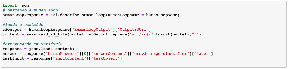 Vamos utilizar o nome do human loop que armazenamos anteriormente para buscar o local exato do json, faremos a leitura de seu conteúdo e armazenaremos itens importantes para a análise da resposta.