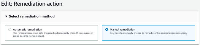 Passo2: Em Remediation action, no sub-menu Select remediation method, você deve escolher se a remediação será automática* ou manual.