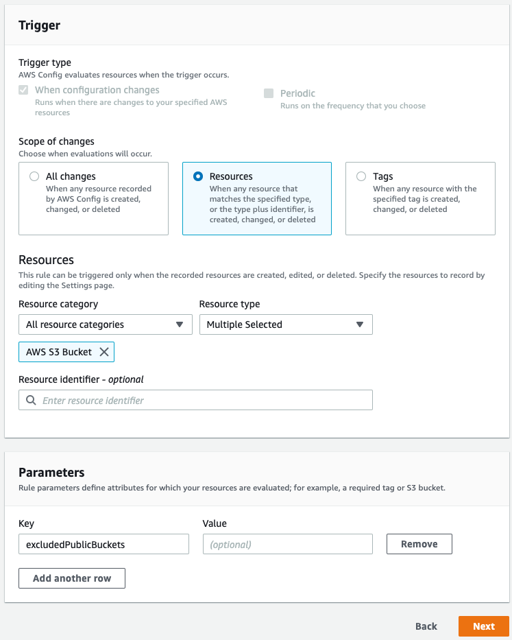 Passo 3: Nesta outra etapa, as configurações da seção Trigger (gatilho) devem ser mantidas. Nas configurações da seção Parameters podemos informar, de forma opcional, o parâmetro excludedPublicBuckets ao AWS Config, que usará essa informação para definir qual ou quais buckets (separados por vírgula) podem ser públicos e ficarão fora dessa regra de conformidade.