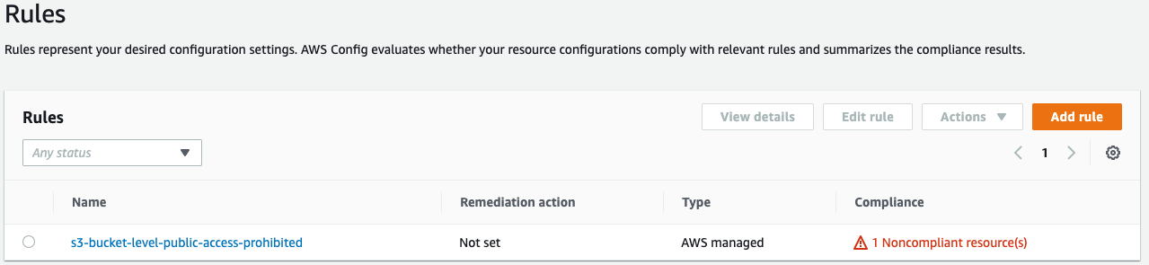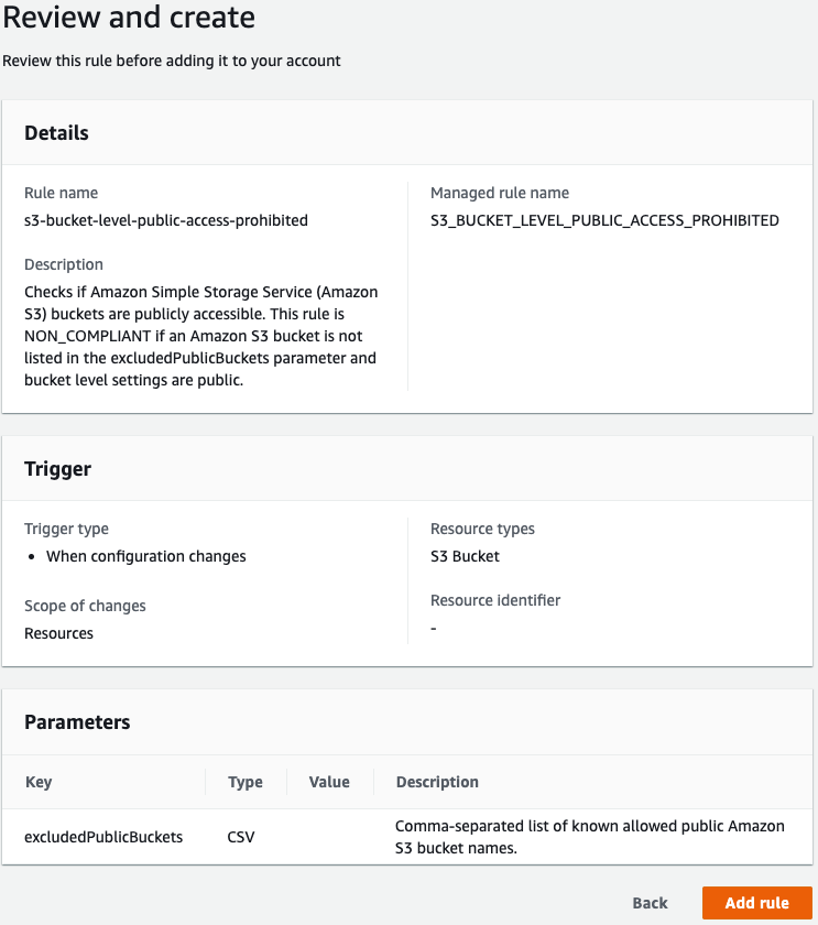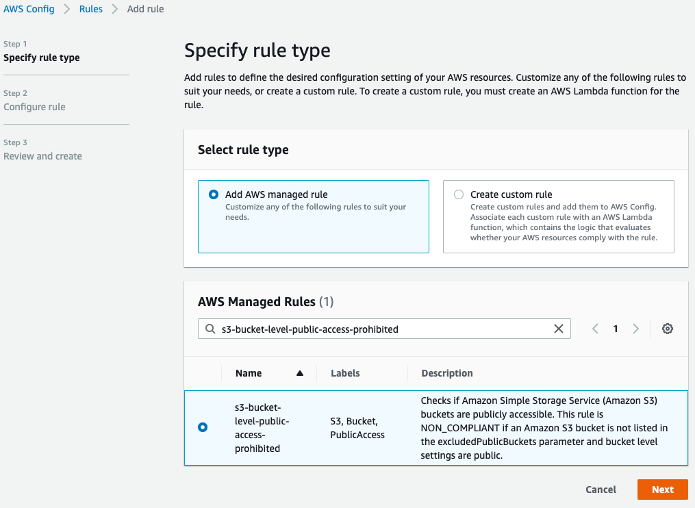 Passo 2: Clique em Add rule para adicionar uma regra gerenciada pela AWS. Para essa análise de conformidade, utilizaremos a regra gerenciada chamada s3-bucket-level-public-access-prohibited.