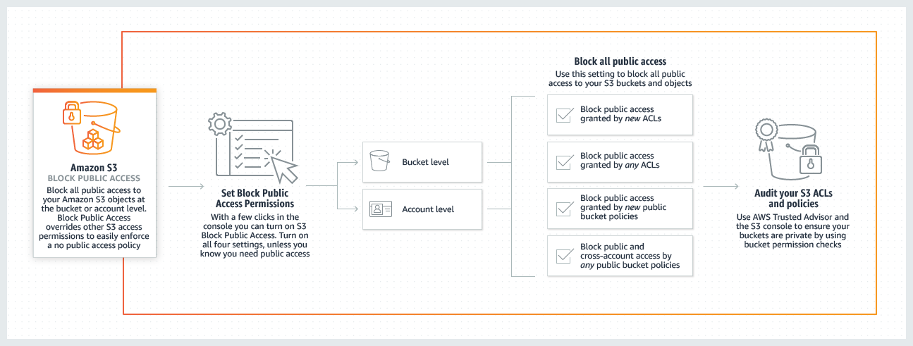 O Amazon Simple Storage Service, ou Amazon S3, é um serviço de armazenamento de objetos e possui configurações nativas para bloqueio de acesso público, podendo ser configurado a nível de conta da AWS ou a nível de bucket, para que os objetos nunca tenham acesso público, agora ou no futuro.