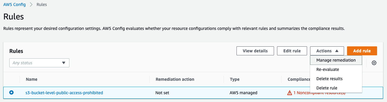 Passo 1: Para criar a remediação, volte ao AWS Config, acesse a lista de Rules, selecione a Rule com o nome s3-bucket-level-public-access-prohibited, clique em Actions e Manage remediations.