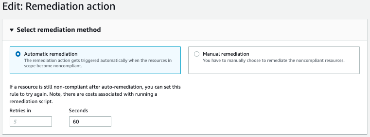 Neste caso, o script está configurado para que a remediação seja executada de forma manual, para evitar problemas de bloqueios de buckets de forma indevida. Entretanto, essa execução manual pode ser alterada para automática no console do AWS Config.
