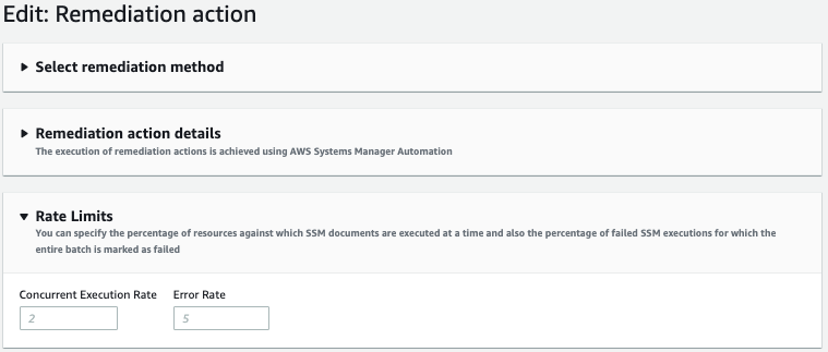 Passo 4: O sub-menu Rate Limits é utilizado para configurar quantas remediações o Systems Manager irá executar simultaneamente. Neste caso podemos manter os parâmetros padrões de: