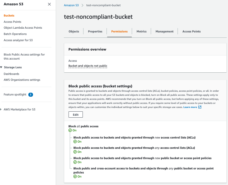 Após isto, você poderá validar o sucesso da remediação acessando o Bucket que foi definido como Noncompliant e validar se a configuração de Block public access está ativa e como Block all.
