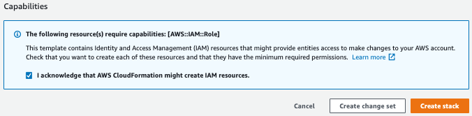 Será necessário selecionar a caixa de “I acknowledge that AWS CloudFormation might create IAM resources” e clicar em Create stack, da mesma forma que fizemos no passo anterior.