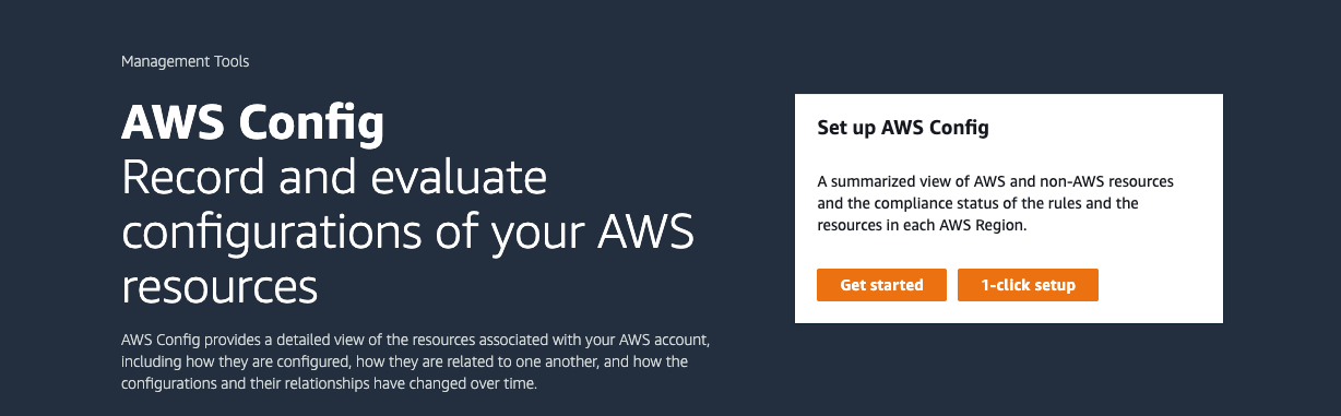 Passo 2: Caso o AWS Config não esteja configurado, clique no botão “1-click setup”, siga para a tela de revisão e confirme a configuração inicial do serviço.