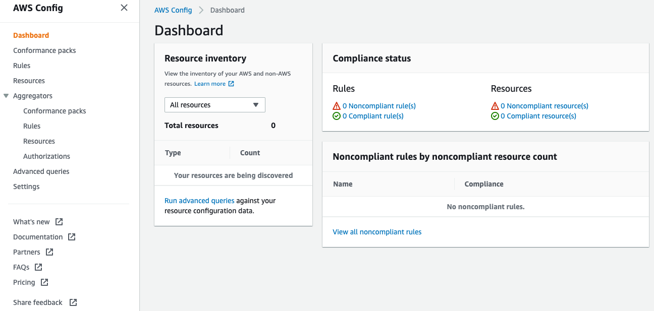 Passo 3: Após essa primeira configuração do AWS Config, a tela inicial do serviço será a seguinte: