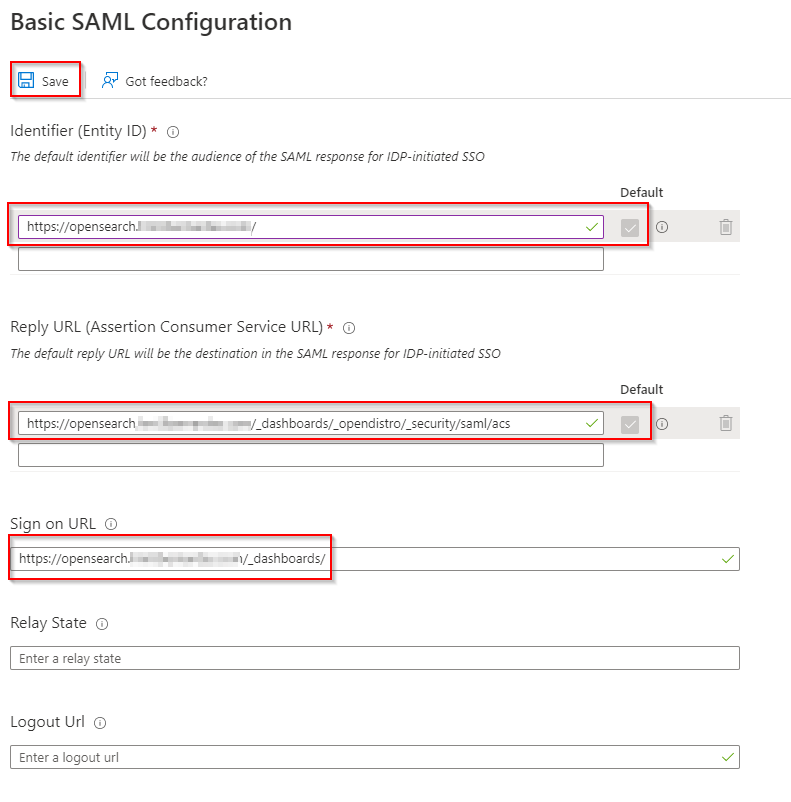 | Campo no Azure AD | Valor da console do Amazon OpenSearch Service |