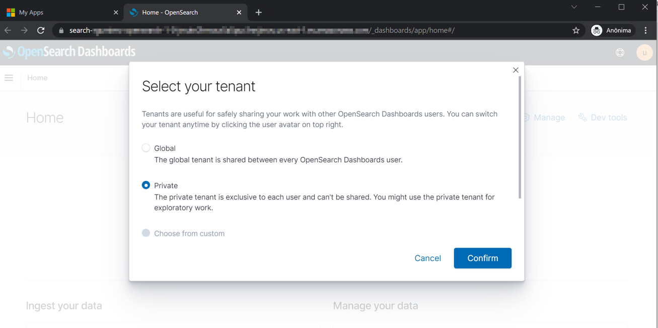 Nota: Tenants no OpenSearch Dashboards são espaços para salvar padrões de índice, visualizações, painéis e outros objetos do OpenSearch Dashboards. Por padrão, todos os usuários do OpenSearch Dashboards têm acesso a dois tenants: Privado e Global. O tenant global é compartilhado entre todos os usuários do OpenSearch Dashboards. O tenant privado é exclusivo para cada usuário e não pode ser compartilhado.