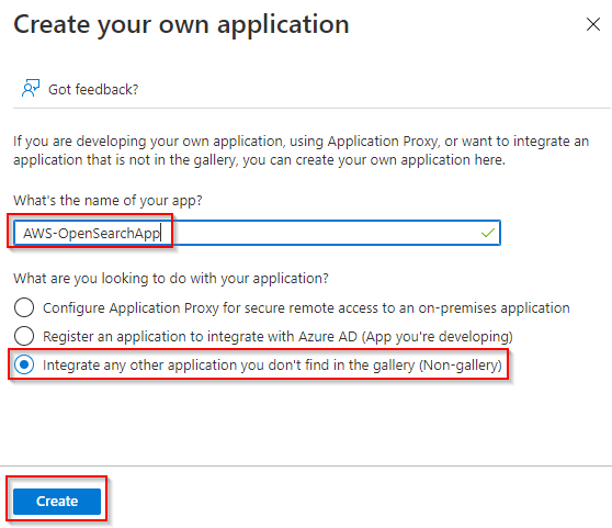 Na lâmina aberta no lado direito, preenchemos a aplicação com um nome de fácil identificação, marcamos a opção “Integrate any other application you don’t find in the gallery (Non-gallery)” e clicamos em “Create”:
