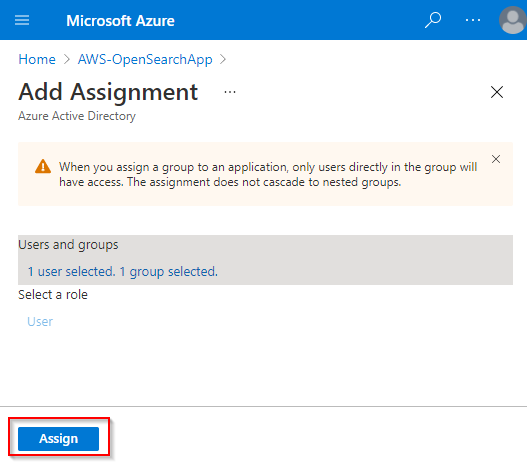 Na tela seguinte, selecionamos usuários e grupos que deveriam ter acesso à aplicação e, consequentemente, conseguiriam fazer o Single-Sign On para o OpenSearch Dashboards. Em seguida clicamos em “Assign”: