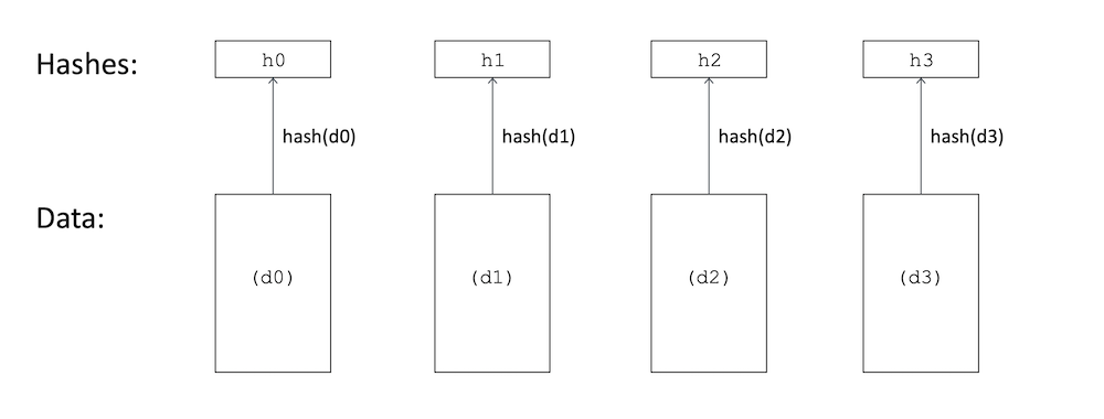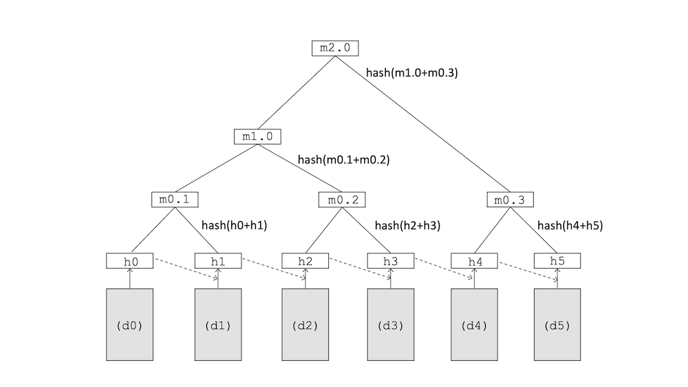 Recalcular a cadeia de hashes inteira durante uma verificação é ineficiente e requer cada vez mais tempo e ciclos computacionais à medida que o journal cresce. Para tornar verificações mais eficientes, nós podemos organizar nossos hashes usando uma árvore Merkle. Uma árvore Merkle é uma estrutura de dados de árvore binária na qual os nós do tipo folha contém um único hash de dados e os nós não-folha contém o hash dos seus dois hashes filhos.