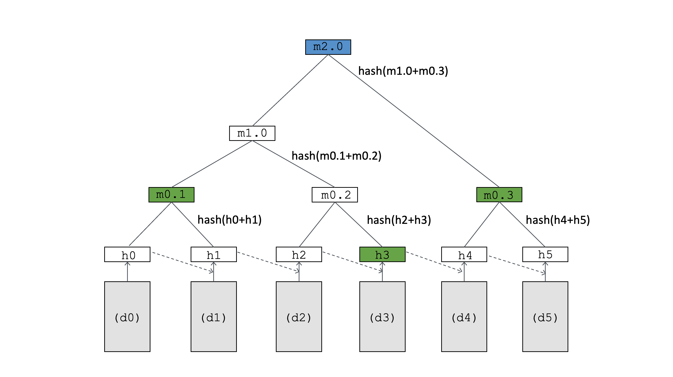 Uma complicação de usar a árvore Merkle para realizar validações é que você simplesmente não tem algumas informações a não ser que você tenha construído a árvore Merkle inteiramente por conta própria, o que derruba seu propósito. Especificamente, você não tem os hashes irmãos em cada nível da árvore e você não tem o hash final, o hash da raiz da árvore Merkle, para fazer a comparação. Felizmente, o Amazon QLDB os fornece para você. O Amazon QLDB chama os hashes irmãos de hashes de prova e chama o hash na raiz da árvore Merkle de digest. No nosso exemplo de verificação, os hashes h3, m0.1, e m0.3 são os hashes de prova fornecidos pelo Amazon QLDB nessa ordem. Eles estão na cor verde no diagrama a seguir. O hash m2.0 é o digest do ledger, na cor azul.