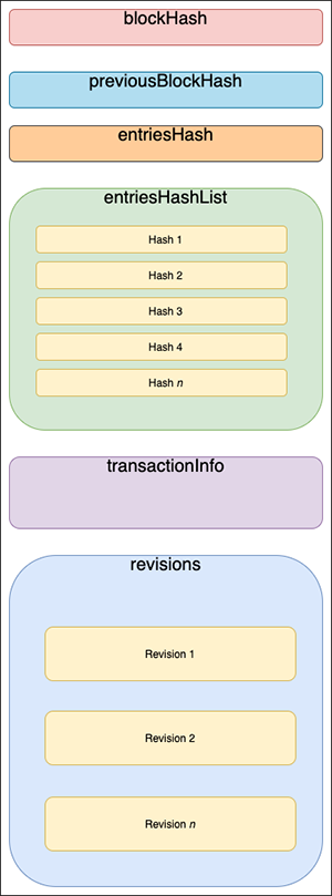 Para verificar o bloco, comece com a sessão revisions. Recalcule o hash de cada revisão e o compare com o hash armazenado com aquela revisão, assim como fizemos quando verificamos a revisão anteriormente nessa postagem. Agora, itere pelos hashes das revisões, concatenando o hash da primeira revisão com o hash da próxima revisão e gerando o hash do resultado, então repita até o fim da lista, assim como fizemos com os hashes de prova. Isso produz um hash final para a sessão revisions. Esse hash deve aparecer na lista entriesHash na sessão do topo do bloco. A sua localização na lista não importa.