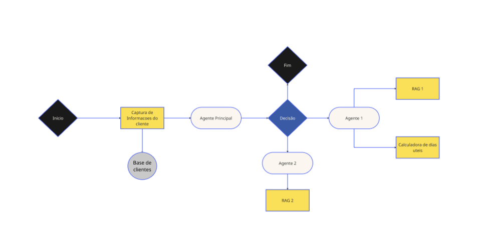 Utilizamos uma arquitetura multiagentes de supervisor e especialistas. Nesse modelo, a pessoa cliente interage somente com o supervisor, que direciona as perguntas para ser formulada pelos agentes especialistas em cada um dos assuntos tratados pelo robô.