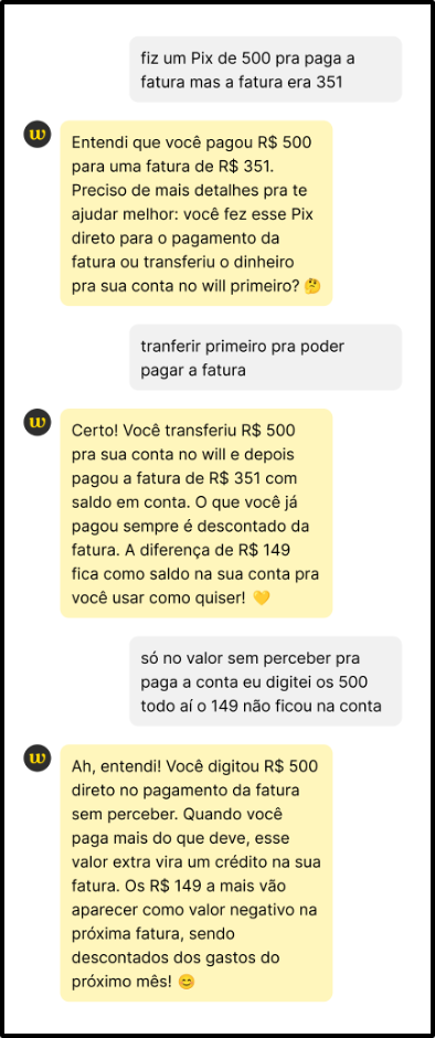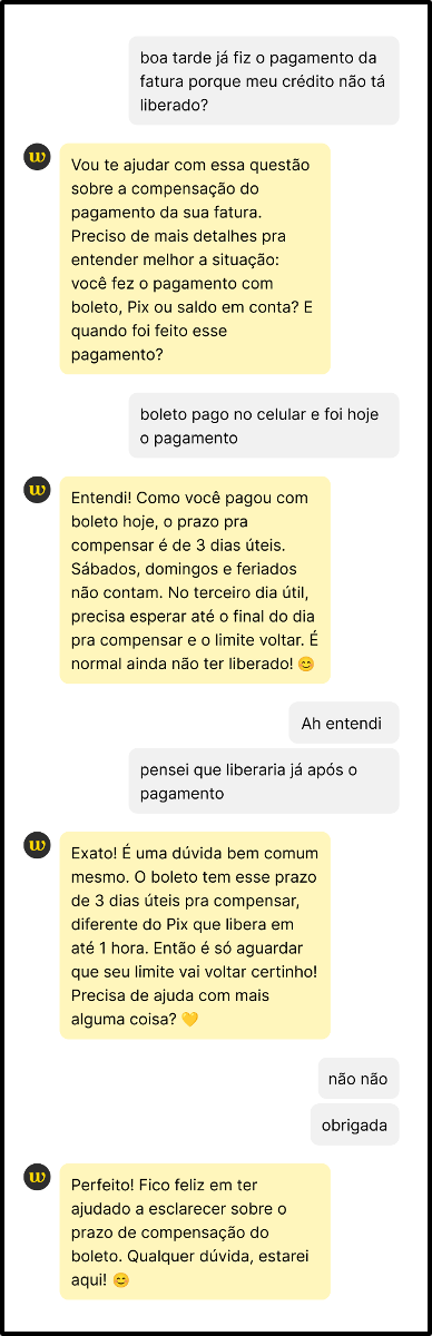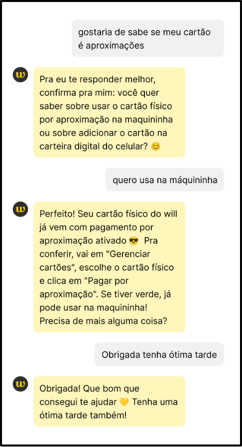 Isso se traduziu na ideia de criar jornadas simples e resolutivas, onde a IA poderia atuar como um assistente inteligente que oferecesse uma experiência fluida e de alta qualidade, reservando a intervenção humana para casos mais complexos e, assim, escalar o atendimento sem perder a conexão e o propósito de inclusão financeira do will bank.