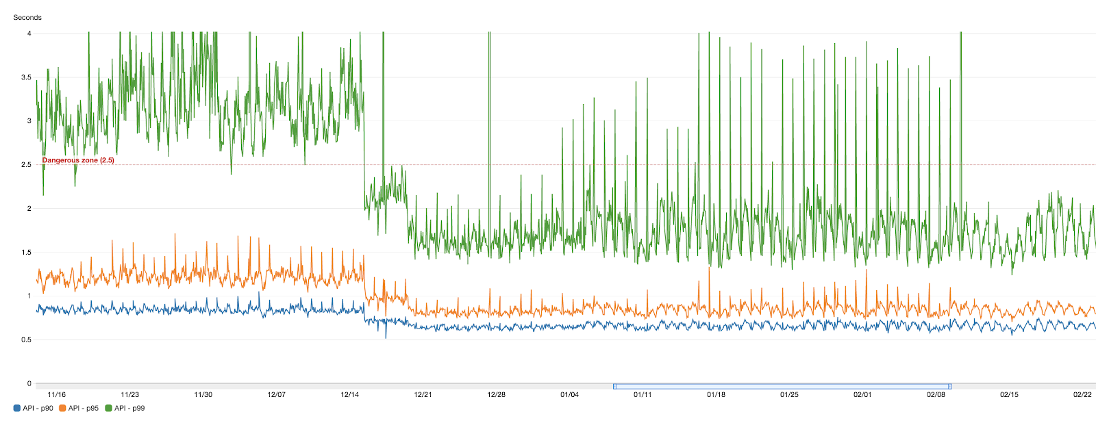 Conseguimos otimizar nosso serviço mais antigo e de pior desempenho para que sua latência fosse reduzida em 15% pelo percentil 95 (p95) em um dia de trabalho típico. Além disso, nossos gráficos de tempo de resposta são muito mais achatados do que antes, pois eliminamos picos de latência que ocorriam quase que regularmente.